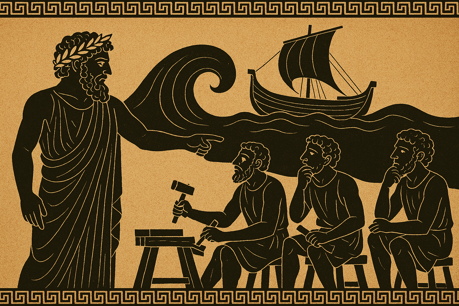 イソップを見下してからかった船大工たちに対し、イソップはこう示した。「お前たちの仕事は、自然の気まぐれ一つで消えるほど脆いのだ」 と。