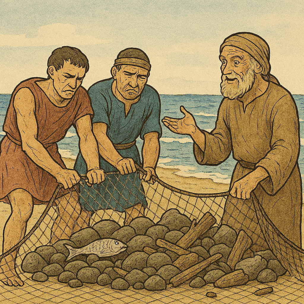 漁師たちが地引網を引いていた。網が重いので大漁だと思い込んで喜んでいたが、浜に引き上げてみると魚はわずかで、ほとんどが石や木ばかりだった。大漁を予想していただけに、漁師たちの落胆は一通りでなく、この結果に腹がたった。