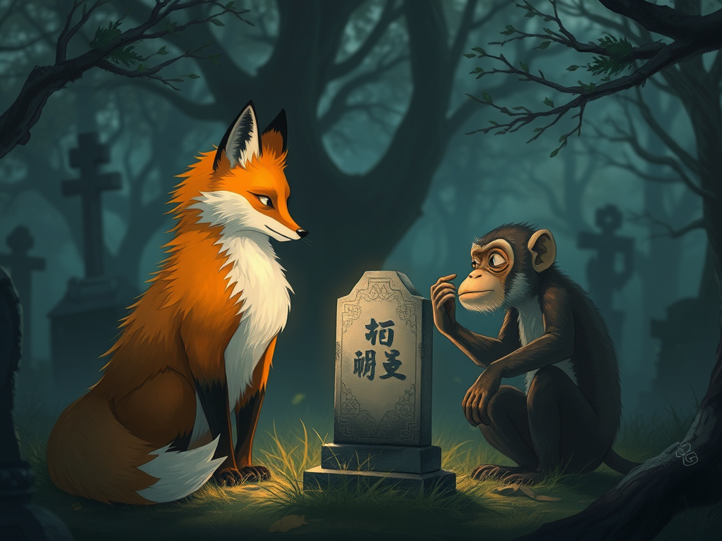 旅の道連れになった狐と猿が家柄を競い合った。双方とも言い合っているうちに、ある墓地にさしかかった。すると猿は一点を見つめシクシク泣き出した。狐がその訳を問うと、猿はお墓をさしながら「ご先祖様が解放した奴隷の墓石をみては泣かずにいられない」と言った。