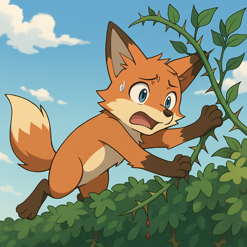 狐が生垣によじ登り、滑り落ちそうになって茨をつかんだ。そうしたところ、茨のとげに足の裏を引っかかれ、血だらけになった。
